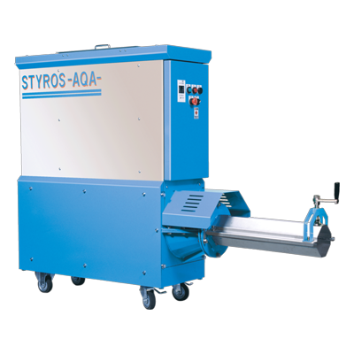 この機種は、発泡スチロールを破砕してブロック状に圧縮成形する減容機。
